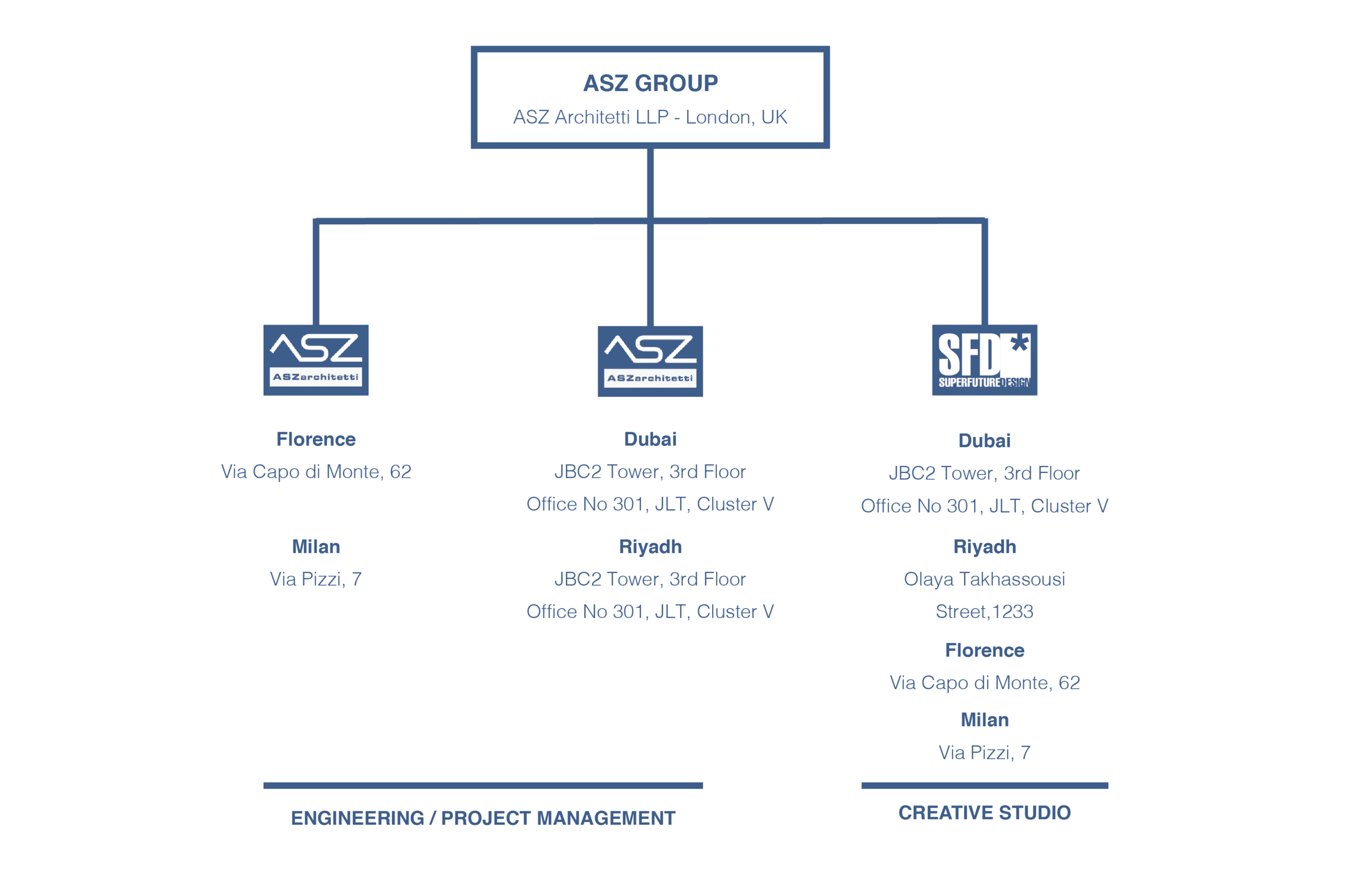 Spread out in four offices – Florence, Milan, Dubai and Riyadh, ASZ architetti Group is made of four companies and two business divisions: ASZ architetti & SUPERFUTUREDESIGN*.